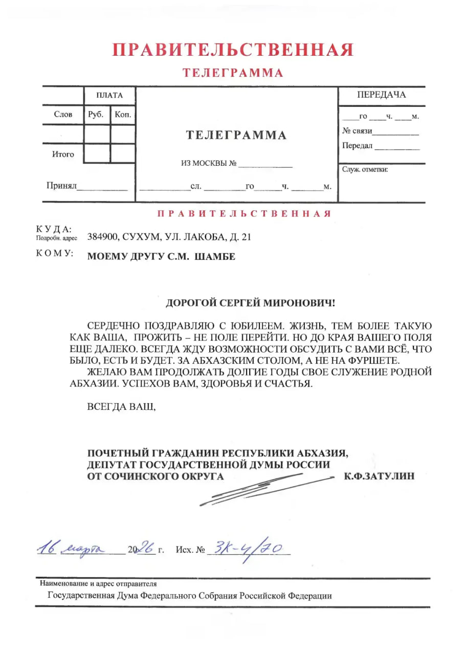 Желаю Вам продолжать долгие годы свое служение родной Абхазии. Успехов Вам, здоровья и счастья.