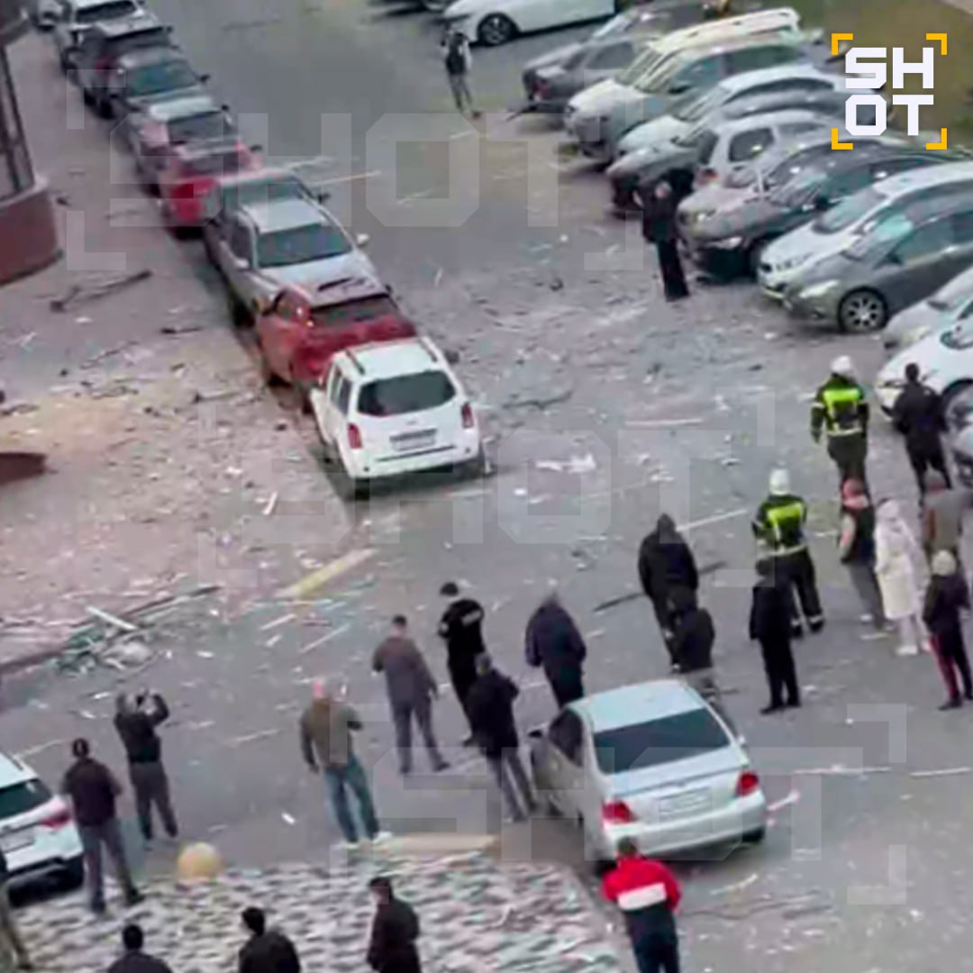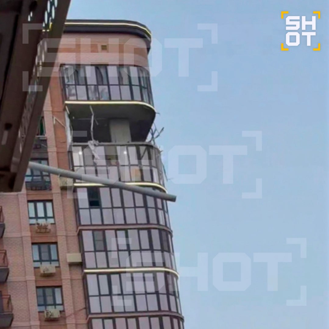 Очевидцы рассказали SHOT, что взрыв прогремел около часа назад. После того как он атаковал здание, посыпались обломки, фасад и стёкла. Полностью разрушен балкон и повреждена квартира. Около 10 припаркованных автомобилей посекло осколками. Точной информации о пострадавших в данный момент нет.