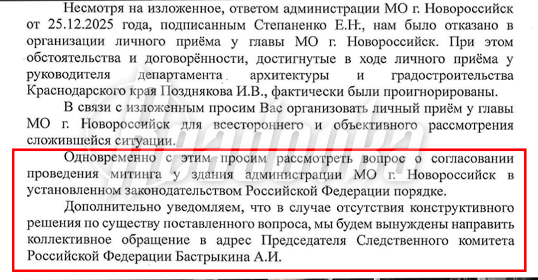 Тем не менее, как заявляют предприниматели, эти рекомендации не были учтены муниципальными властями. Также предприниматели утверждают, что им отказали в проведении личного приема у главы города. Если ситуация не будет урегулирована в ходе публичных слушаний до марта 2026 года, инициативная группа намерена начать проведение акций у здания администрации. Предприниматели требуют вмешательства главы Новороссийска Андрея Кравченко и готовят обращение к председателю Следственного комитета РФ Александру Бастрыкину.