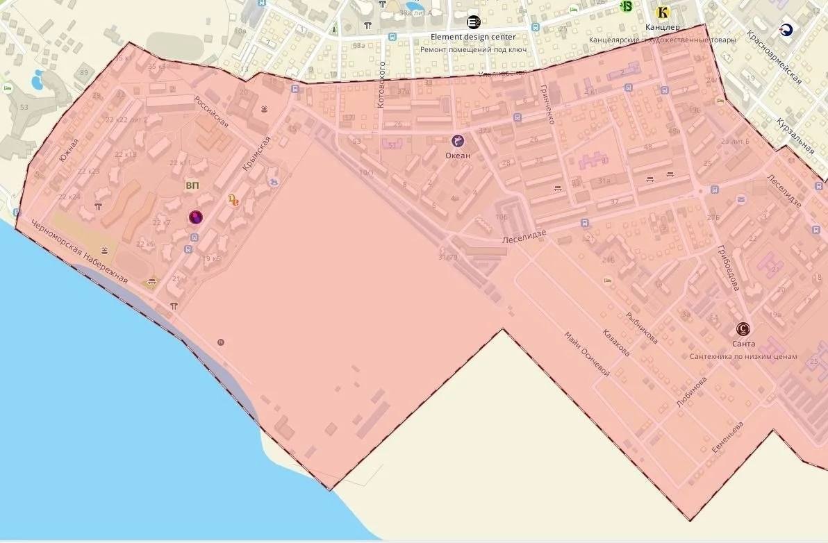 Зона ограничения охватывает микрорайоны Толстый мыс, Магилат, Парус, Южный, Екатерининский, Южная промзона, пос. Светлый, с. Дивноморское (подробнее смотрите на картах). Жителей просим запастись водой. Подвоз воды в накопительные ёмкости многоквартирных домов будет осуществляться по заявкам от управляющих компаний.