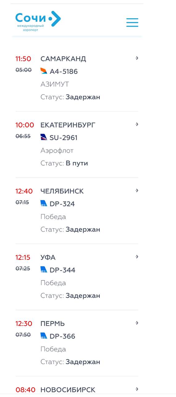 В Краснодаре задержано 4 рейса на вылет и больше 10 — на прилёт. В Сочи ситуация сложнее: около 20 бортов не могут вылететь, ещё более 20 — приземлиться, судя по данным онлайн-табло.