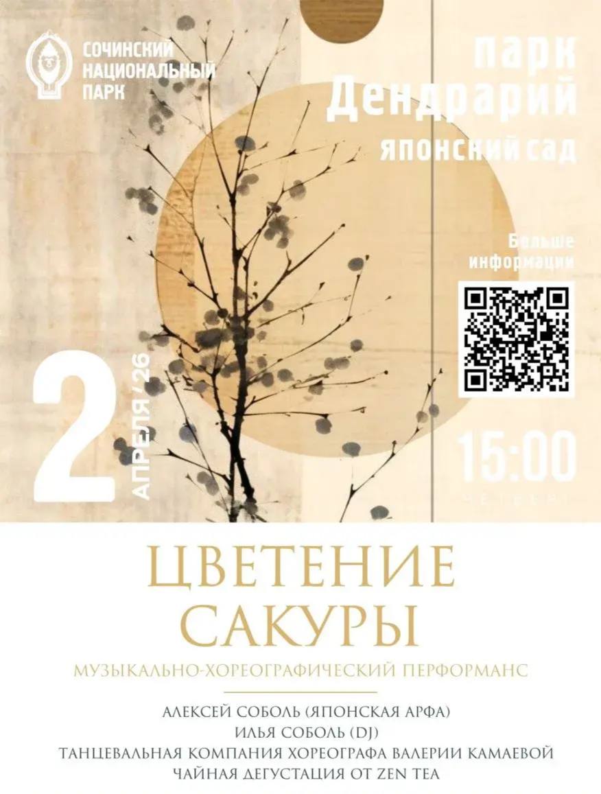 2 апреля 2026 года в 15:00 в Японском садике парка Дендрарий состоится Музыкально-хореографический перформанс «Цветение сакуры» с участием Алексея Соболя (японская арфа), Ильи Соболя (DJ) и танцевальной компании хореографа Валерии Камаевой.