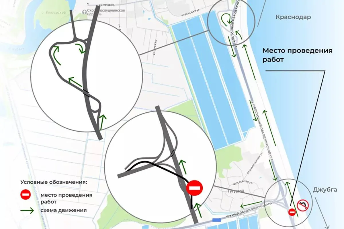 С 24 по 30 апреля будет закрыт съезд с трассы М-4 «Дон» на Южный обход Краснодара в районе водохранилища. Ограничение вводится из-за плановых дорожных работ на эстакаде развязки у аула Тугургой.