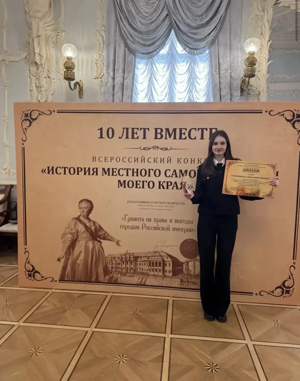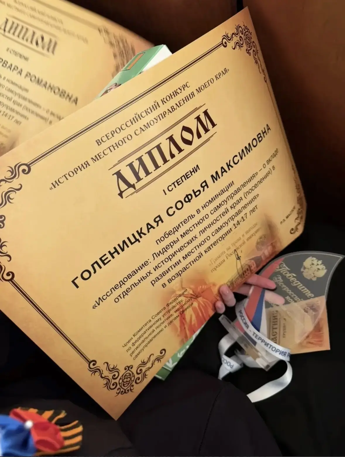 На московской сцене диплом победителя I степени получила ученица новороссийской школы №24 Голеницкая Софья. Тема ее конкурсной работы «О вкладе Гармаш Ивана Григорьевича в развитие местного самоуправления станицы Раевской Краснодарского края» оказалась очень актуальной и интересной.