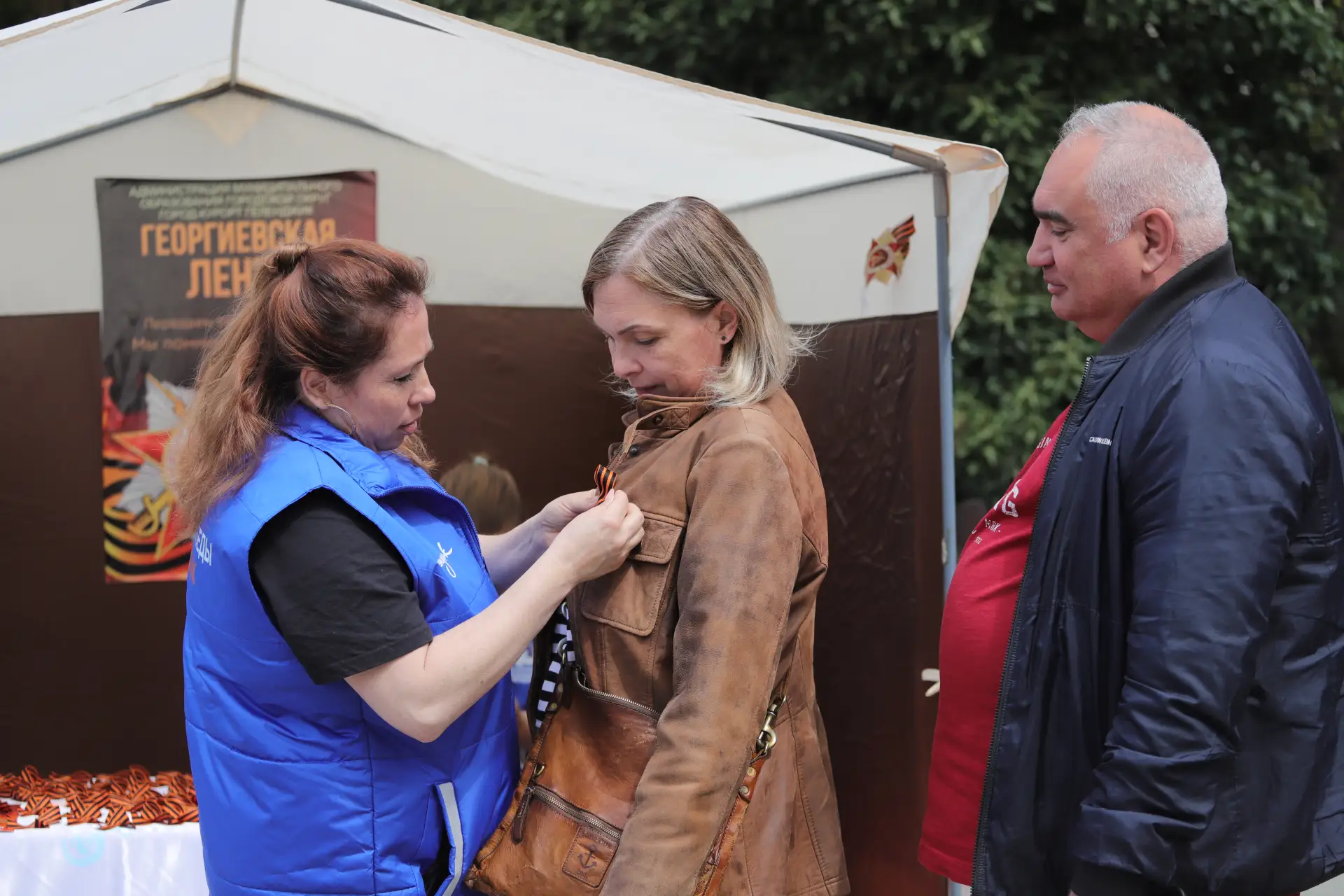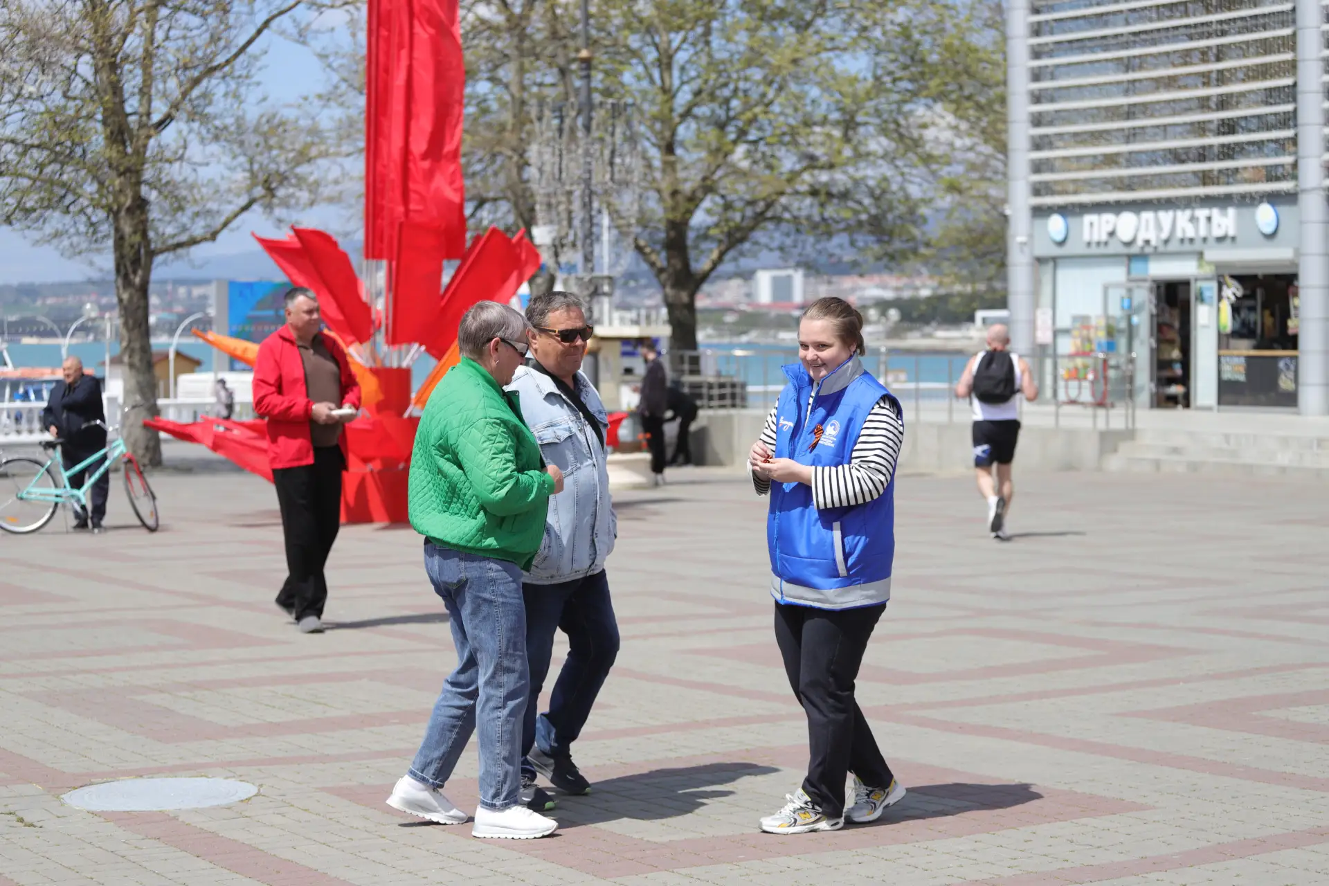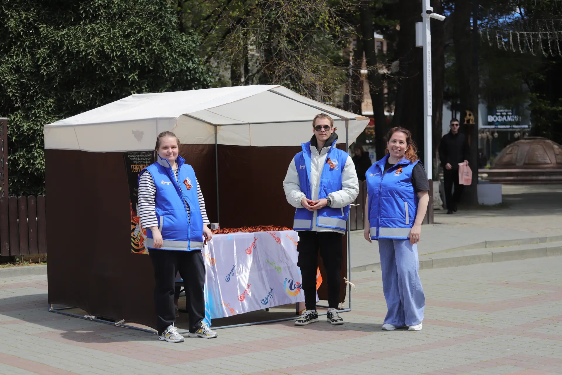 На курорте с 21 апреля по 9 мая включительно проводится всероссийская акция. Каждому желающему волонтеры выдают георгиевскую ленточку - символ Победы.