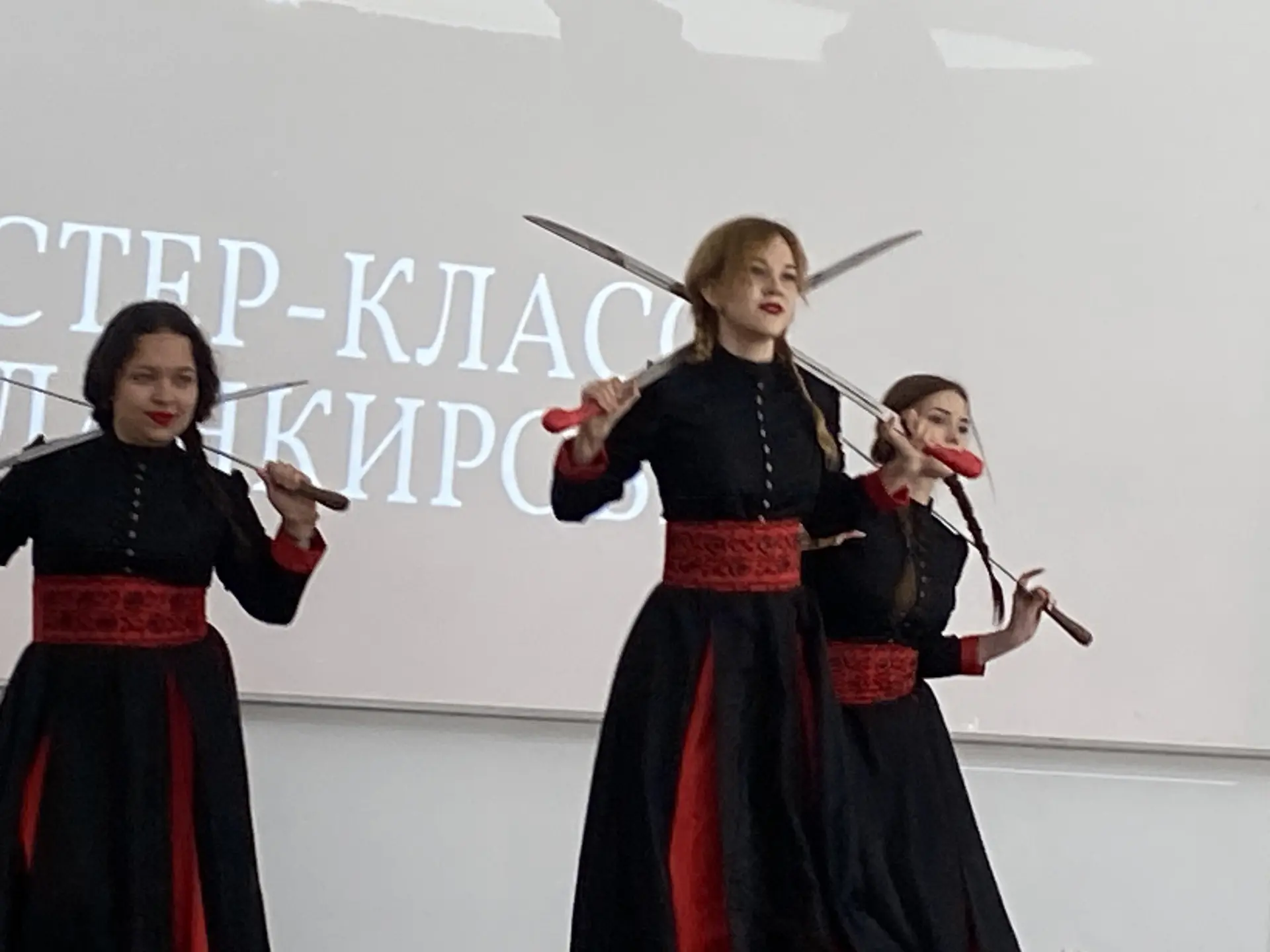 Занятие провели в Новороссийском колледже строительства и экономики молодые солистки ансамбля сценической фланкировки «Дуся да Маруся» из Центра казачьей культуры Новороссийского районного казачьего общества.
