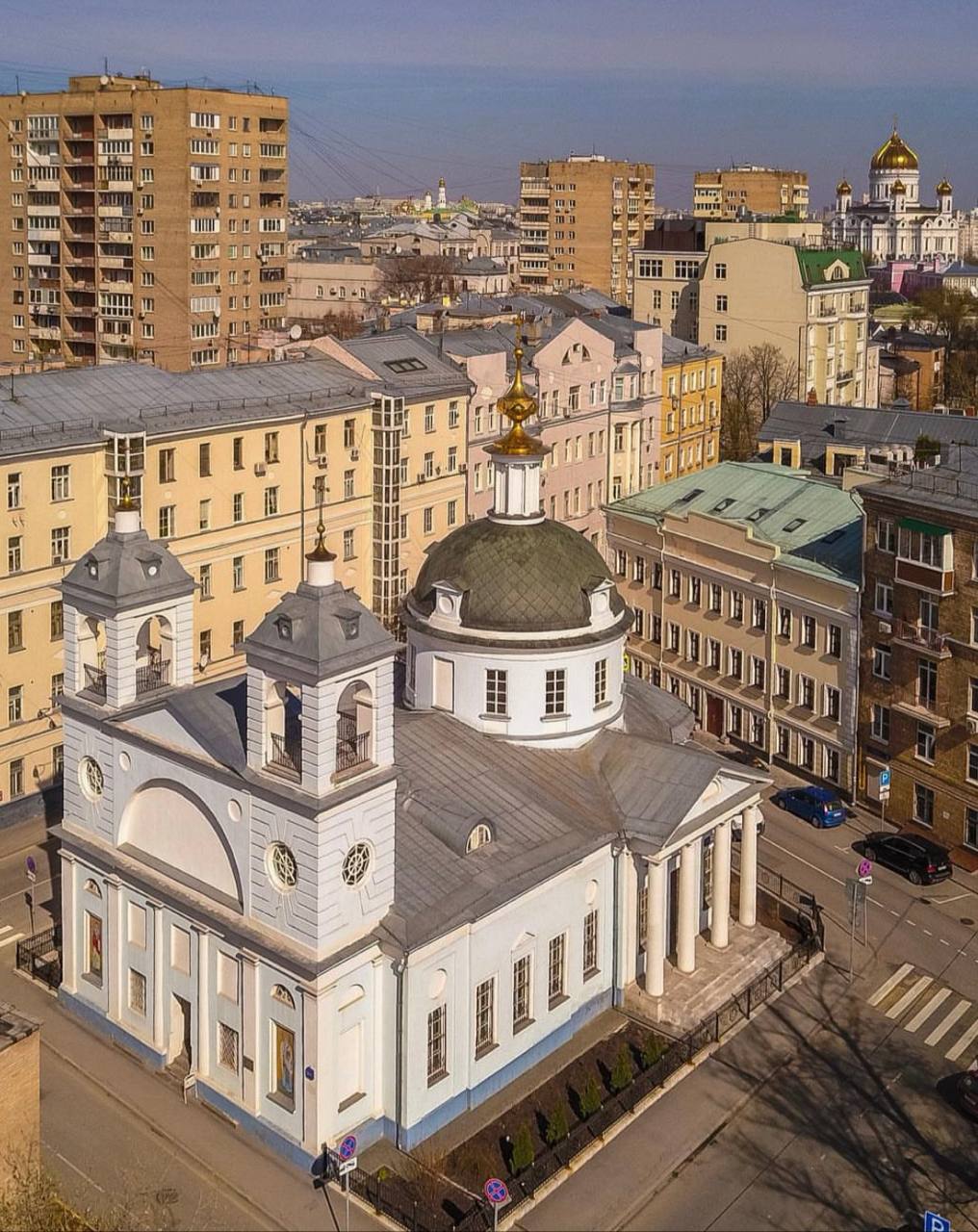 6 По Малому Лёвшинскому переулку пройдем до Большого Лёвшинского, повернем направо и вскоре окажемся на самом маленьком квартале Москвы. Перед вами будет церковь Успения Пресвятой Богородицы в Могильцах, которая стоит одновременно на четырех переулках. Церковь была построена в 1791 году французским архитектором Николя Леграном в классическом стиле. Особенность храма — две колокольни, что является большой редкостью для московского храмового зодчества.