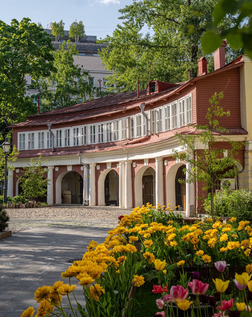 Это редкий для Москвы уцелевший старомосковский дворик, выполненный в форме полукруга. Он сформирован бывшими конюшнями, принадлежавшими когда-то усадьбе Охотникова. В 1879