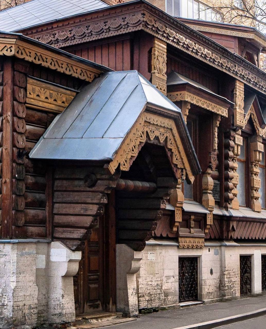 9 Закончим нашу прогулку к другого деревянного дома предпринимателя и мецената Александра Пороховщикова, построенного в 1872 году. Это настоящая изба с красивым резным декором в русском стиле. Проект дома выполненный архитектором А. Л. Гуном, в 1873 году был отмечен дипломом на выставке в Веке. Сруб сложен из довольно толстых брёвен, в которых резьбой украшены даже торцы.