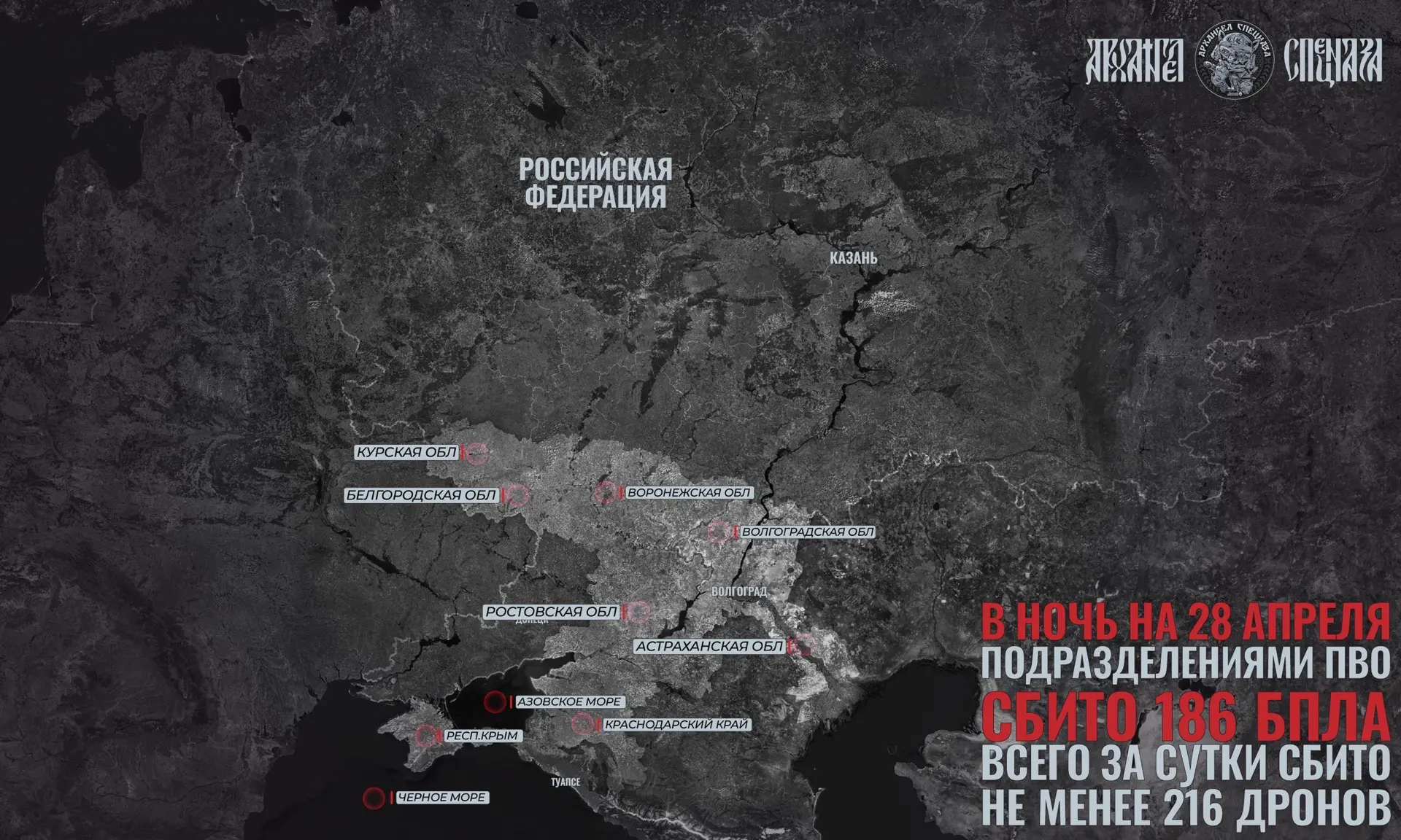 Подразделениями ПВО в ночь на 28 апреля было сбито 186 БпЛА. Всего за сутки уничтожено не менее 216 дронов, и большая часть поражена над Черным морем и Краснодарским краем.