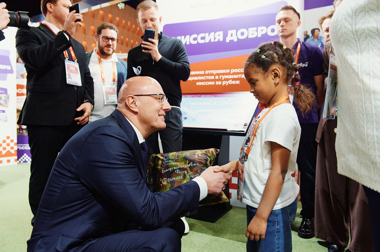 Дмитрий Чернышенко также оценил выставку добровольческих достижений и пообщался с волонтерами. Например, ему представили проект по реабилитации животных, пострадавших в зоне СВО.