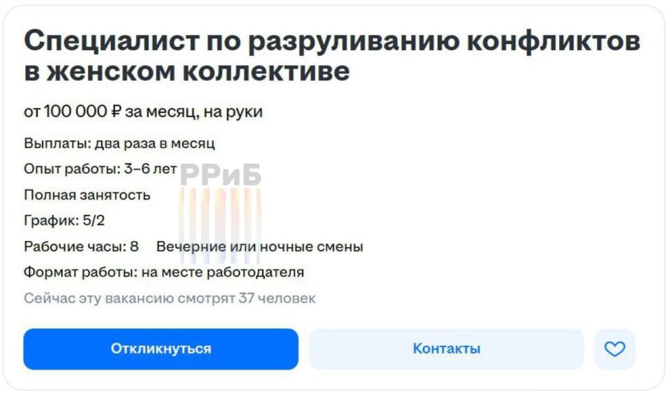 Там готовы платить от 100 тысяч на руки за разруливание конфликтов в женском коллективе.Сотрудник должен уметь тушить эмоциональные пожары, вести «мирные переговоры» из-за температуры в офисе, а также расшифровывать многозначительные взгляды.Что-то...