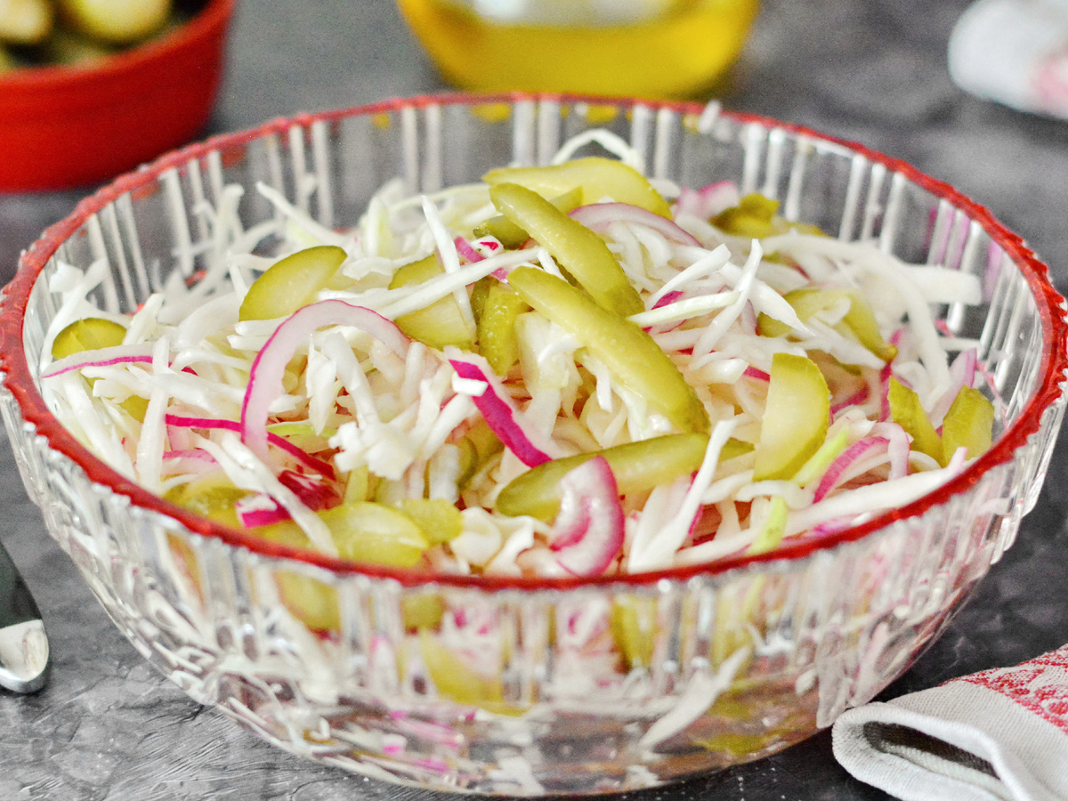 Смешайте капусту и лук в большой миске, добавьте чайную ложку сахара и хорошенько перетрите смесь руками, чтобы капуста немного смягчилась, а лук пустил сок. Затем добавьте огурцы и столовую ложку масла, аккуратно перемешайте. Соль в данном рецепте не понадобится, так как соленые огурцы обеспечивают необходимый вкус.