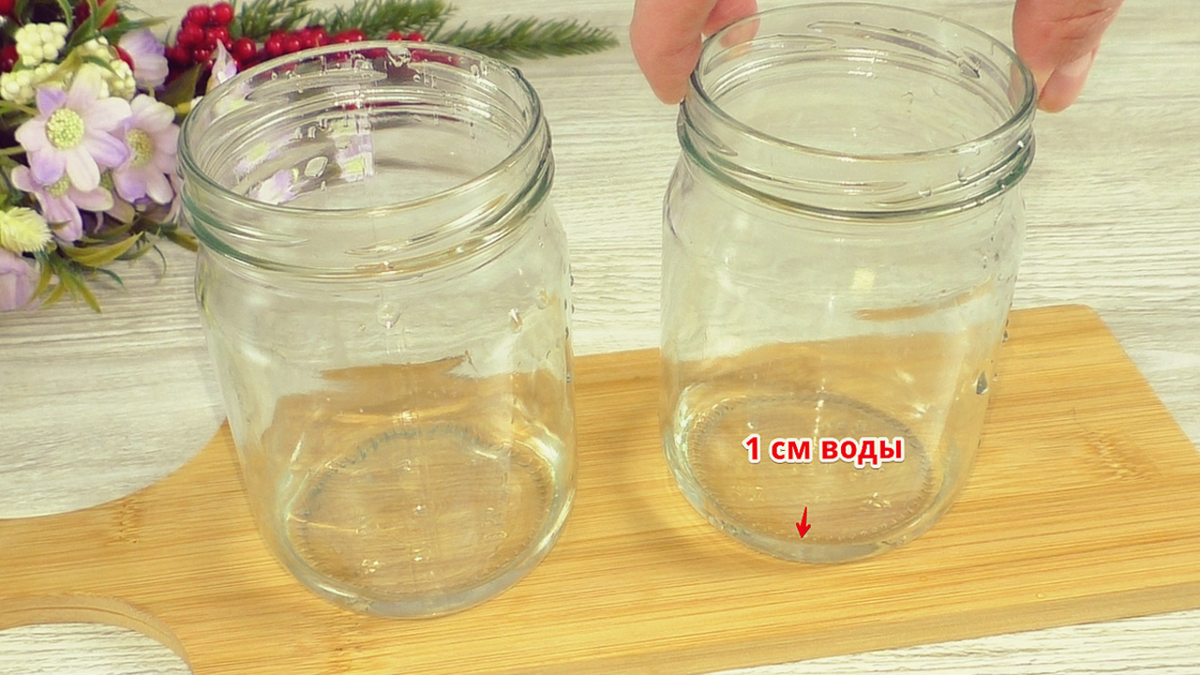 Первый шаг к успешной заготовке заключается в подготовке контейнеров. Лучше всего подойдут банки объемом 500 мл, которые нужно обязательно простерилизовать. Для этого в каждую банку налить немного холодной воды (примерно 1 см от дна) и поставить в микроволновую печь на 3 минуты при мощности 800 Вт. После завершения стерилизации воду следует аккуратно вылить.