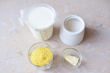 Варка: В кастрюле доведите молоко до кипения с добавлением сахара и щепотки соли. Аккуратно влейте подготовленное пшено и, помешивая, доведите до нового кипения.