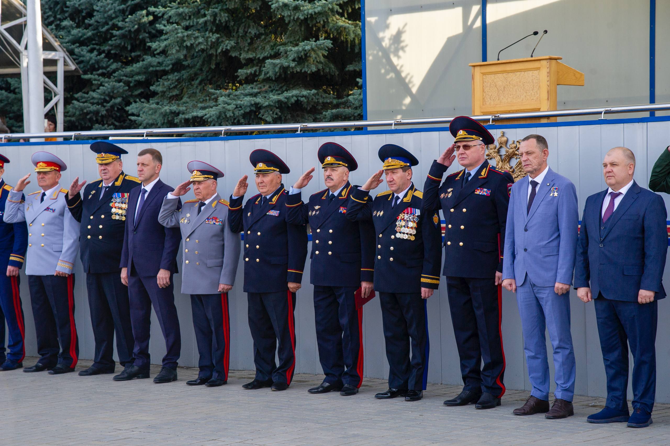 Почётные гости привели курсантов к Присяге и вручили им первые служебные удостоверения. Под аккомпанемент духового оркестра личный состав университета исполнил Государственный гимн Российской Федерации.