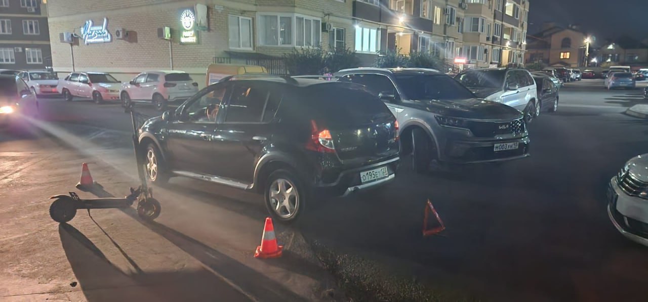 В Анапе несовершеннолетние на электросамокате разогнались так, что затормозить вовремя не получилось. Итог — они врезались в Reno.