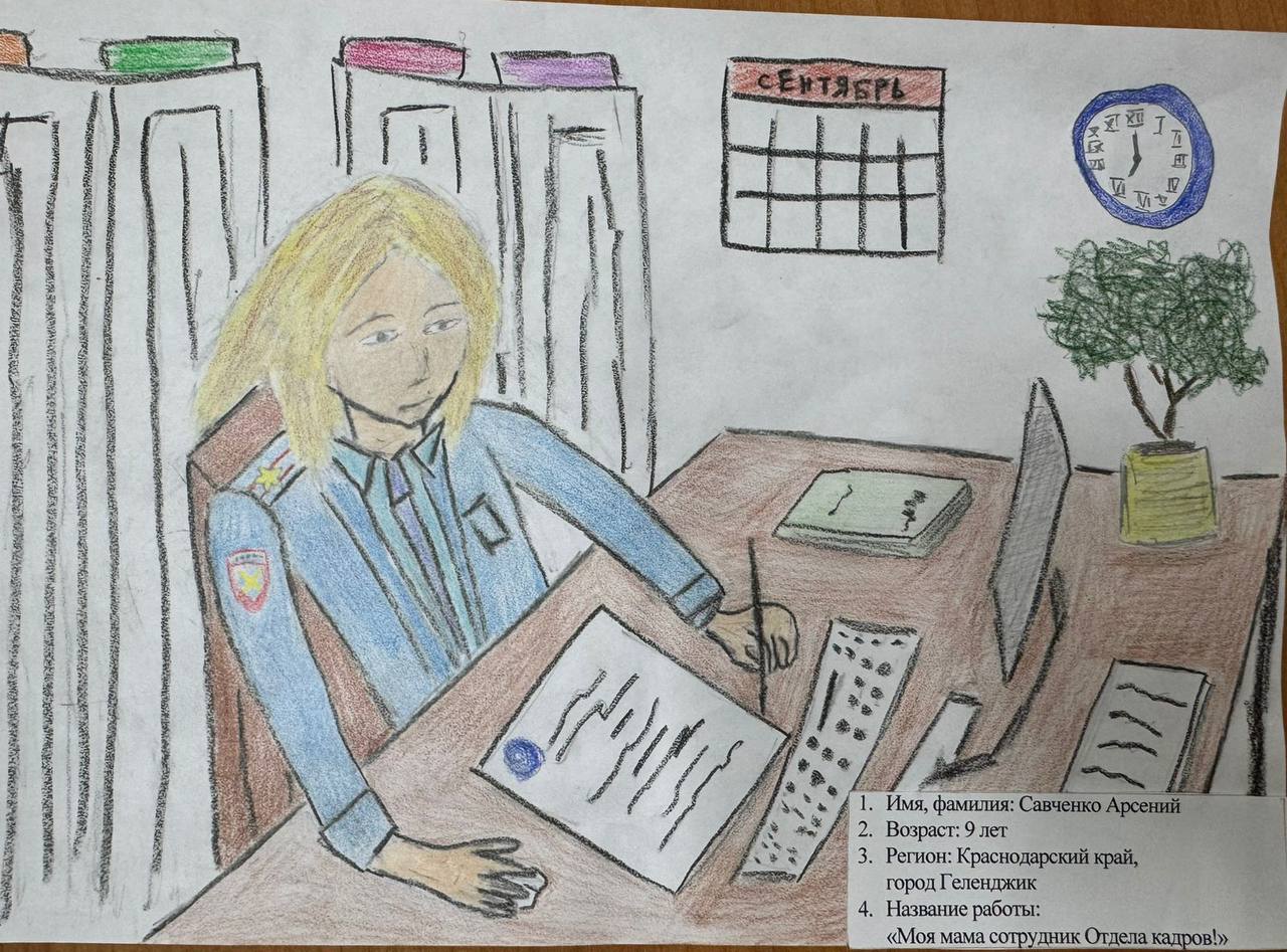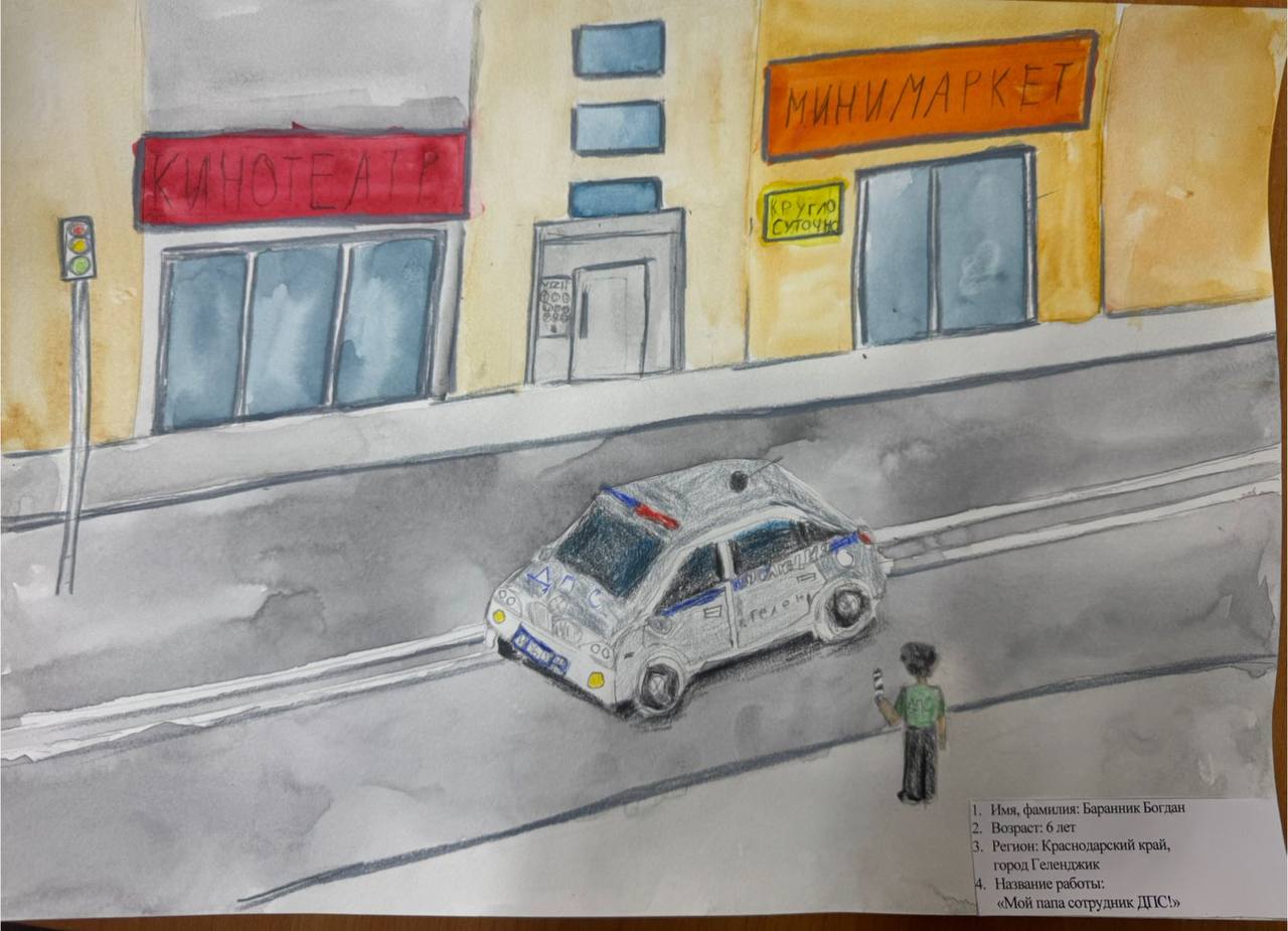 В номинации для участников 6–8 лет победителем стал Богдан Баранник с рисунком «Мой папа — сотрудник ДПС», выполненным красками.В категории 9–11 лет лучшей признана работа Арсения Савченко «Моя мама — сотрудник Отдела кадров».
