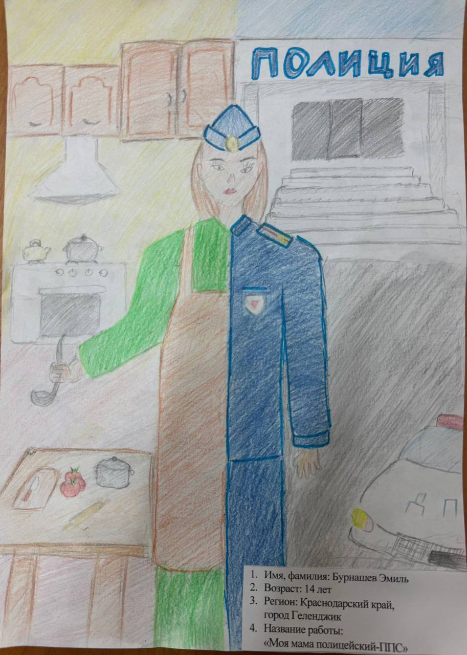 Среди детей 12–14 лет жюри отметило работу Эмиля Бурнашева «Моя мама — полицейский ППС».