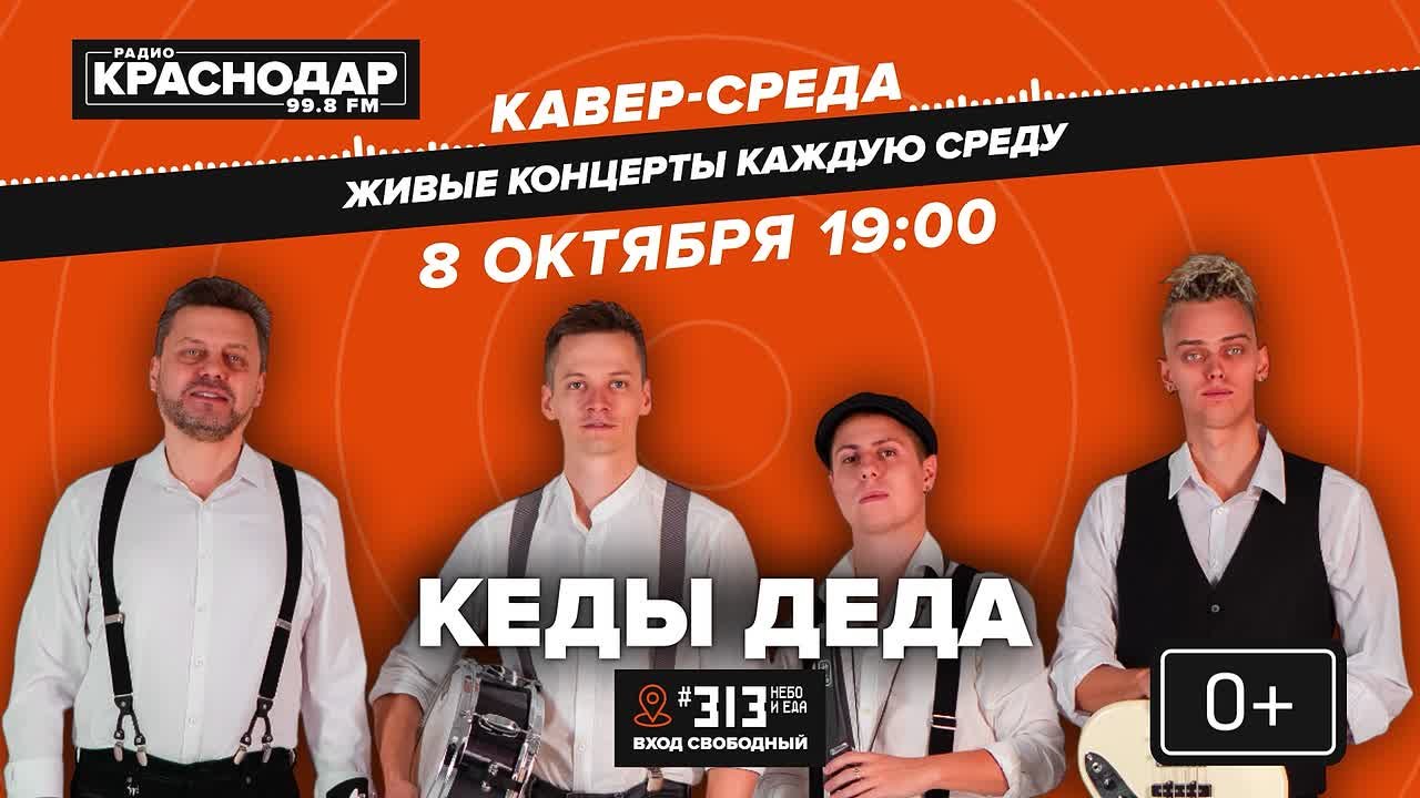Второй концерт нового сезона КАВЕР-СРЕДЫ от радио «Краснодар». На нем выступит группа «КЕДЫ ДЕДА» с любимыми народными хитами. Будем петь все вместе песни Найка Борзова, группы Браво, Жуков и хитов из советских фильмов и мультфильмов. Такое пропустить точно нельзя.