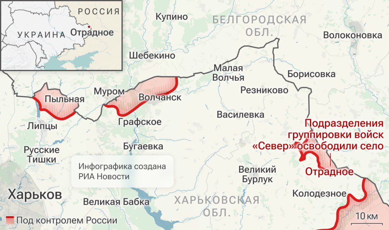 Российские войска взяли под контроль Отрадное в Харьковской области, сообщили в Минобороны.