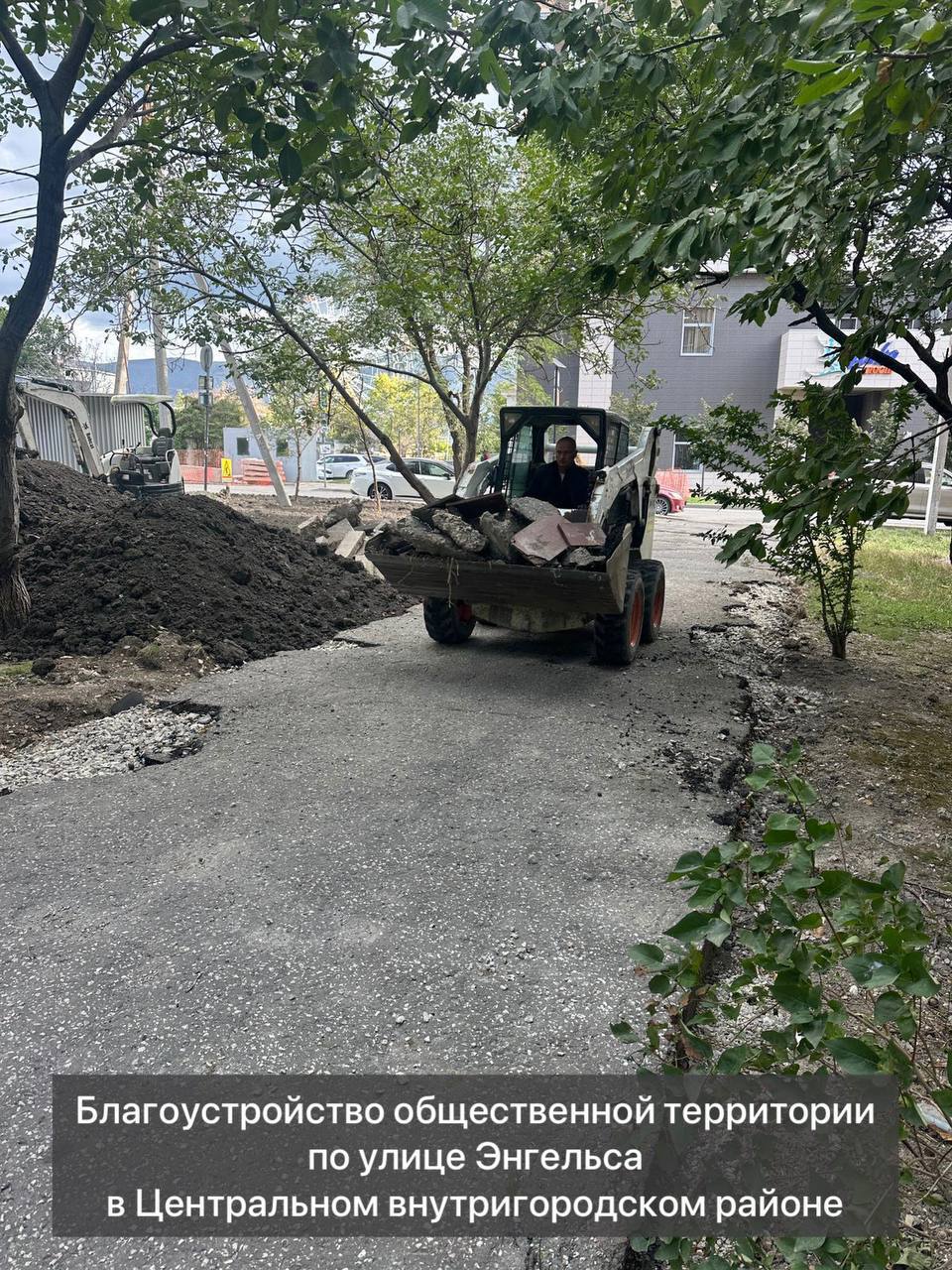 Продолжается реализация еще одного значимого проекта – благоустройство общественной территории по улице Энгельса. Совсем скоро здесь появится комфортная и безопасная транзитная зона по пути к набережной. Проведены работы по опиловке деревьев, начат демонтаж старого покрытия и монтаж тротуарной плитки.
