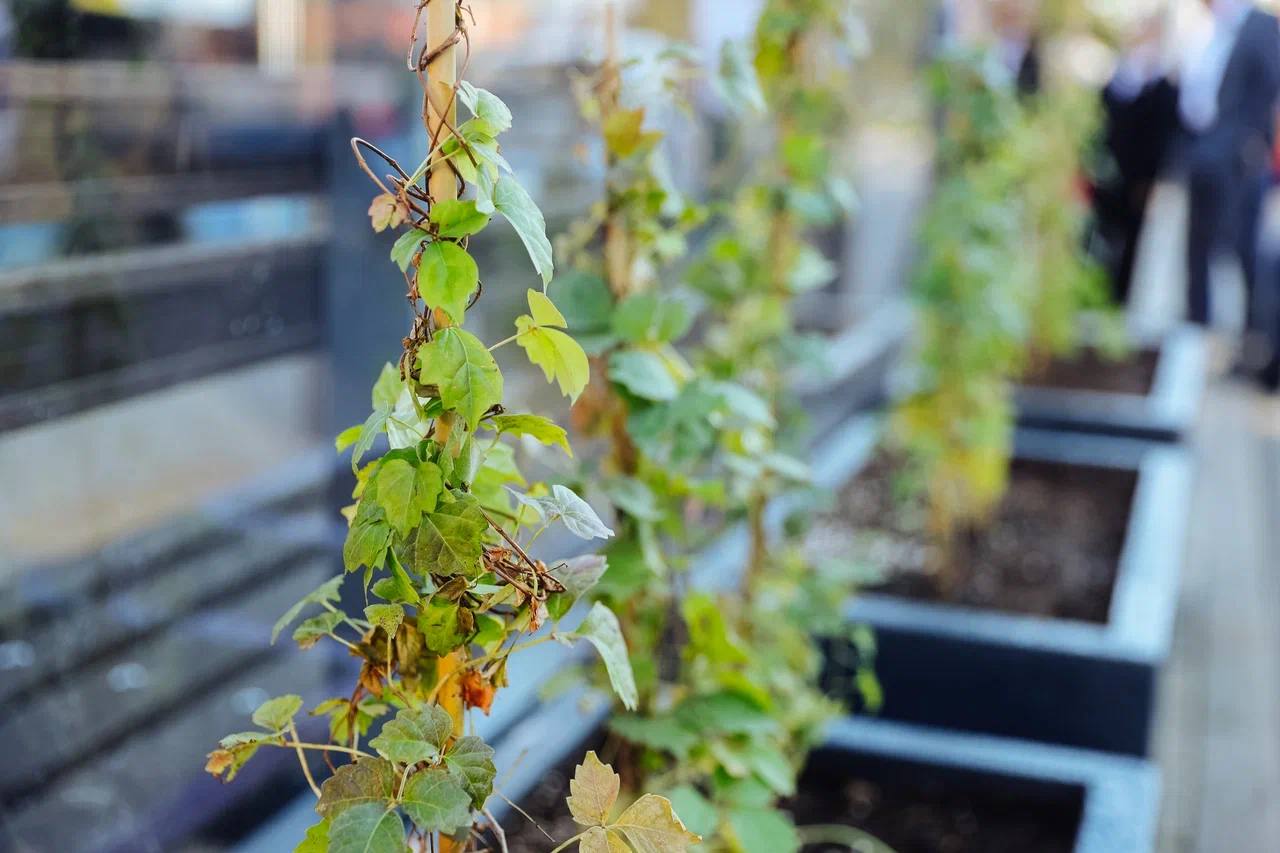 Рядом с остановкой установили несколько кадок с пока ещё небольшими кустами винограда. По задумке, подрастая, он будет обвивать павильон. Растения будут регулярно поливать.