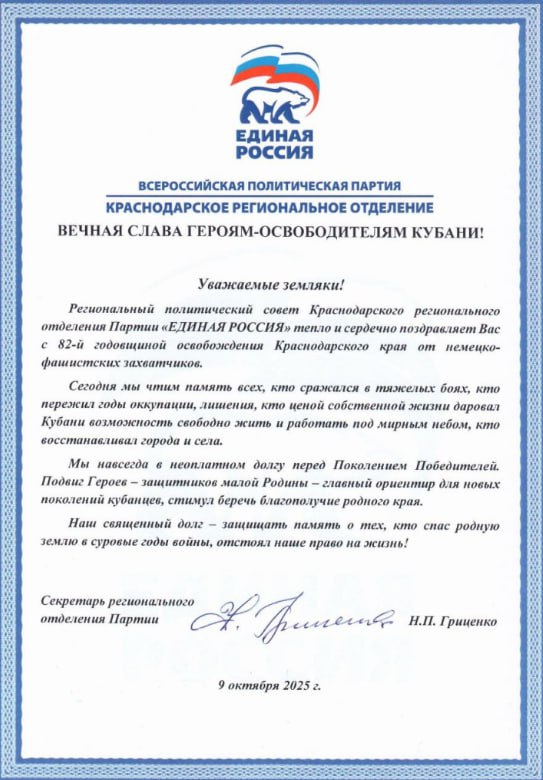 – Уважаемые земляки! Сердечно поздравляю вас со значимой датой. Мы чтим память всех, кто сражался в тяжелых боях, кто пережил годы оккупации, лишения, кто ценой собственной жизни даровал Кубани возможность свободно жить и работать под мирным небом, кто восстанавливал города и села.Мы навсегда в неоплатном долгу перед Поколением Победителей. Подвиг Героев – защитников малой Родины – главный ориентир для новых поколений кубанцев, стимул беречь благополучие родного края. Наш священный долг – защищать память о тех, кто спас родную землю в суровые годы войны, отстоял наше право на жизнь!
