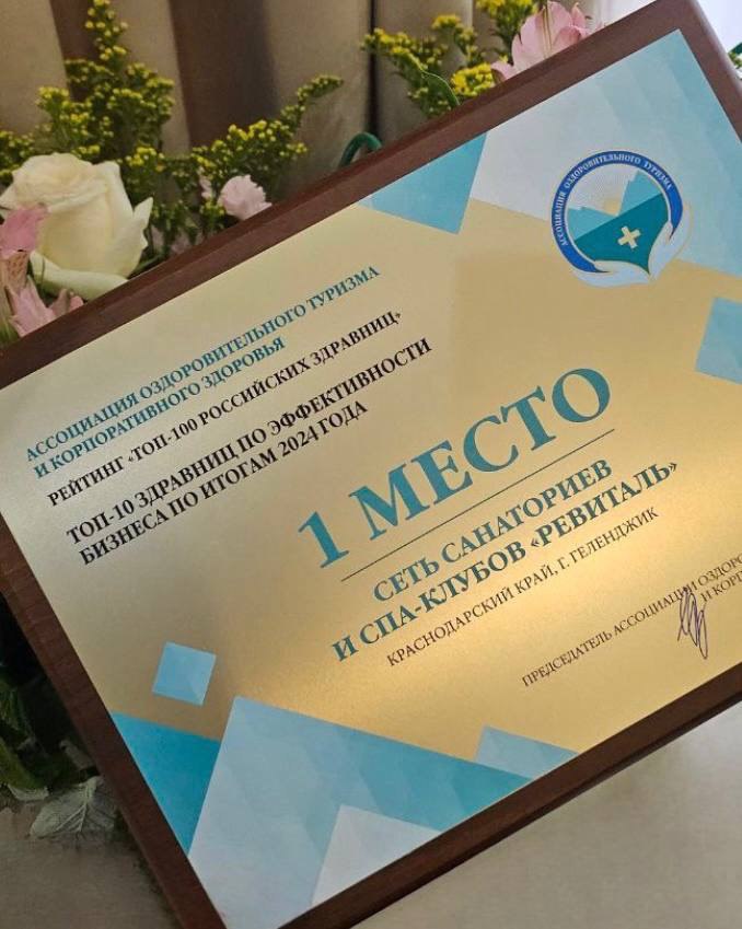 Сеть санаториев и спа-клубов «Ревиталь» из Геленджика заняла 12 место в общем (консолидированном) списке лучших здравниц страны. В двух номинациях сеть уверенно вышла на 1 место по показателю эффективности бизнеса и инвестиционному потенциалу.