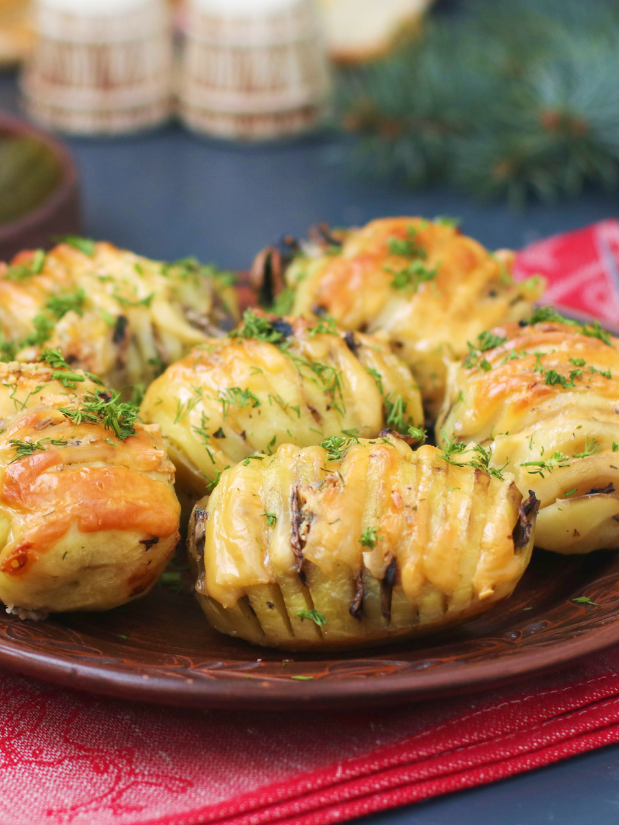 Подготовка картошки: Очистите картофель и аккуратно сделайте глубокие разрезы вдоль, оставляя примерно сантиметр от дна. Эта техника создаст эффект гармошки и придаст блюду необычный вид.