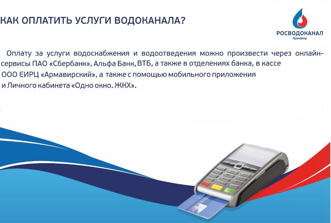 Оплату за услуги водоснабжения и водоотведения можно произвести через онлайн-сервисы ПАО «Сбербанк», Альфа Банк и ВТБ, а также в отделениях банка, в кассе ООО ЕИРЦ «Армавирский», а также с помощью мобильного приложения и Личного кабинета «Одно окно. ЖКХ».