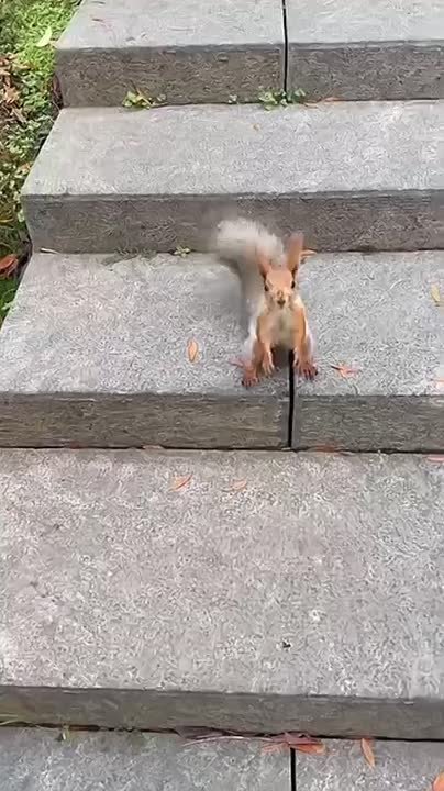 На кадрах белка в поисках еды настолько осмелела, что не только близко подошла к людям, но и запрыгнула на них.