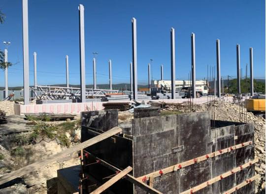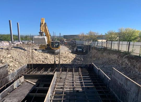 На сегодняшний день выполнены земляные работы по подготовке котлованов, а также доставлены элементы металлического каркаса будущего комплекса. Завершено армирование и бетонирование фундаментов, частично проведена обратная засыпка котлованов и начат монтаж металлоконструкций.
