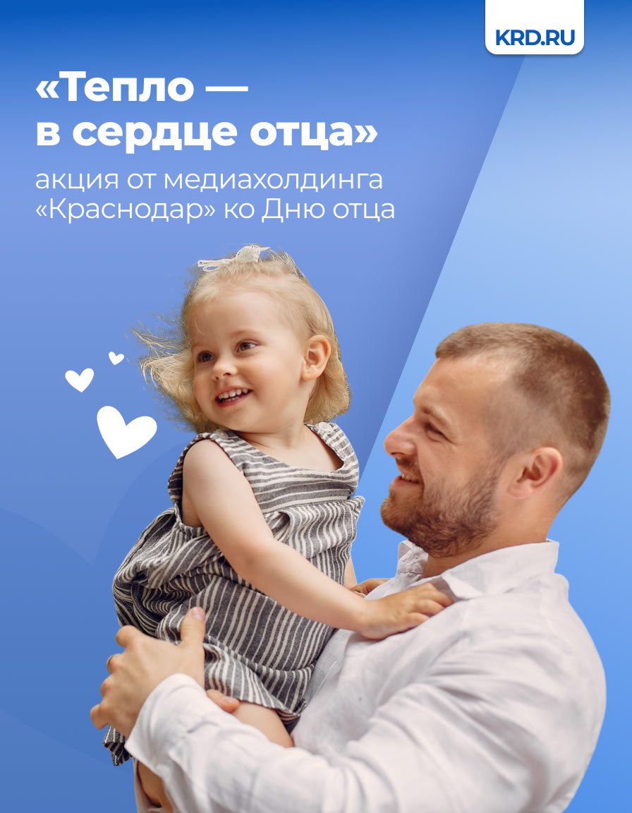 Медиахолдинг «Краснодар» запустил акцию «Тепло — в сердце отца». Жители города могут прислать фотографии с поздравлениями своих пап до 16 октября включительно. Открытки покажут на главном городском экране 18 и 19 октября на улице Красной, 122.