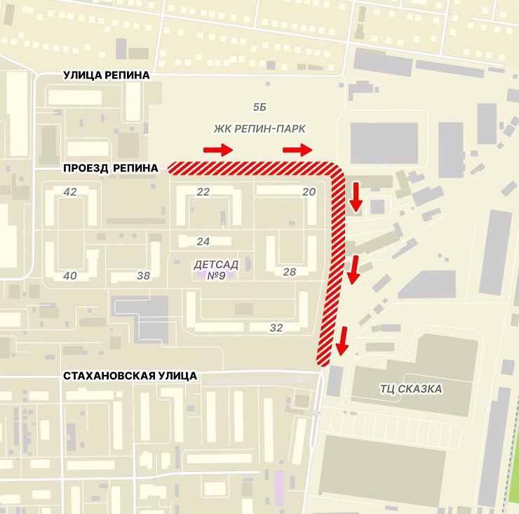 С 16 октября по 30 ноября на участке проезда Репина, от улицы Стахановской до дома 5Б, будет ограничено движение из-за прокладки новых сетей водоотведения. В этот период на улице Стахановской будет организовано одностороннее движение в обратном направлении.