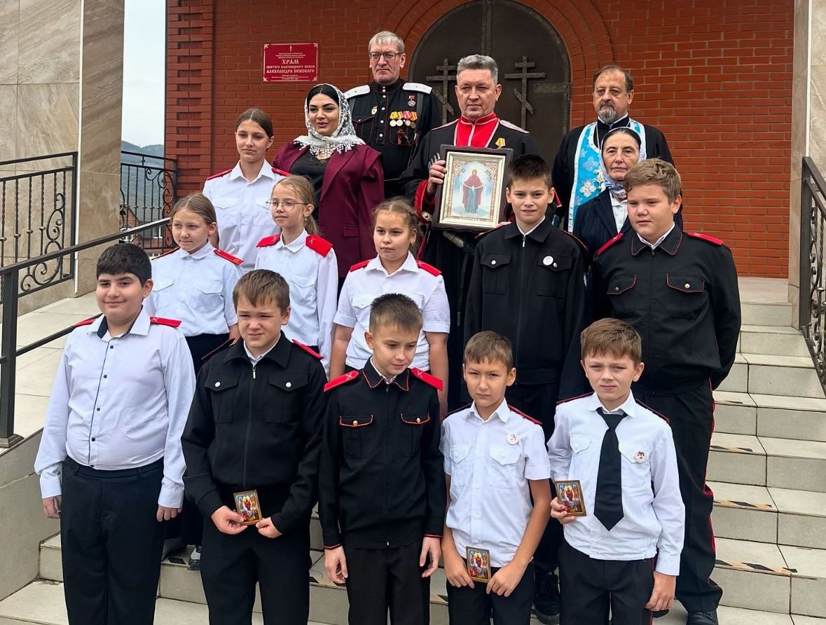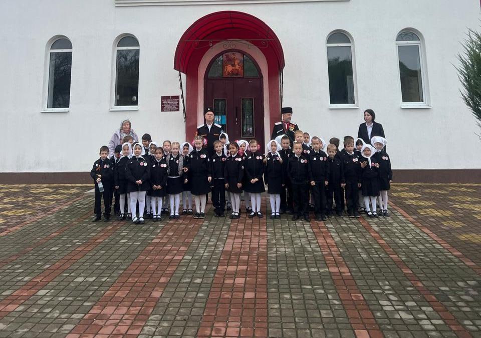 Казаки-наставники и старейшины общества начали обряд с посещения первоклашками храма Георгия Победоносца в соседней станице Натухаевской, где священнослужитель благословил ребят на добрый путь.