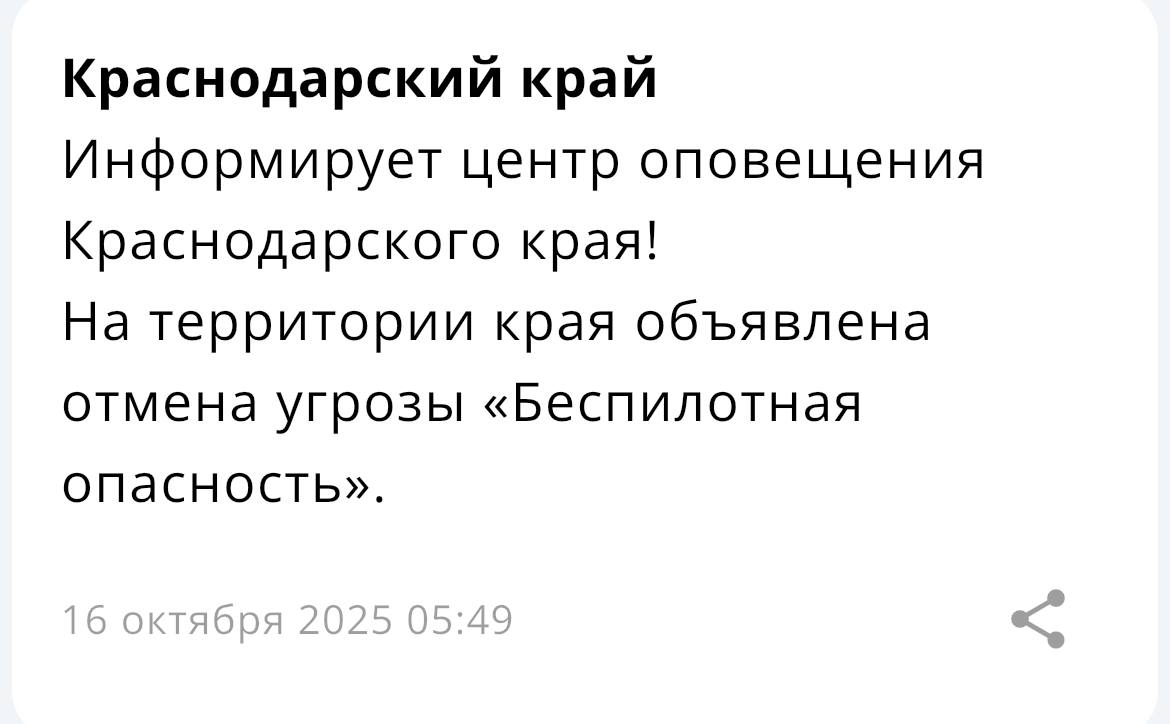 В муниципалитете объявлена «Беспилотная опасность», сообщил глава округа Сергей Бойко. Тем временем в других районах Кубани опасность отменена, информирует центр оповещения края.