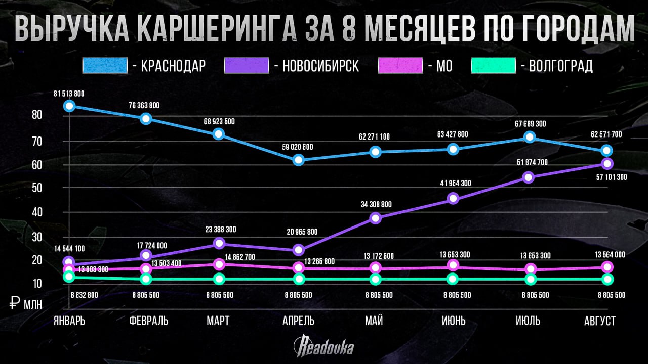 За восемь месяцев 2025 года россияне потратили на каршеринг почти 47 млрд —это на 16% больше, чем годом ранее, следует из данных Росстата, проанализированных Readovka. 95,7% рынка пришлось на Москву — 45 млрд. На втором месте Краснодар с 541 млн, замыкает тройку Новосибирск, где наездили на 261 млн.