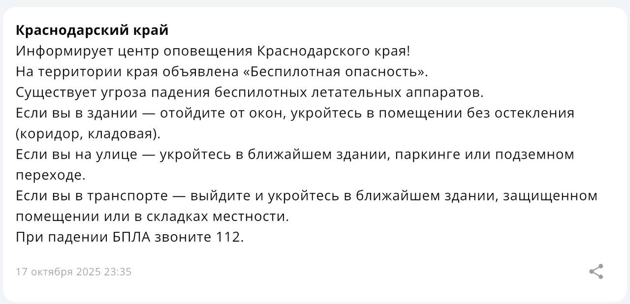 ВНИМАНИЕНа территории города Сочи ОБЪЯВЛЕНА УГРОЗА атаки беспилотных летательных аппаратов (БПЛА)Если вы находитесь дома:• Не подходите к окнам• Укройтесь в комнате, окна которой не выходят на море или в помещении без...