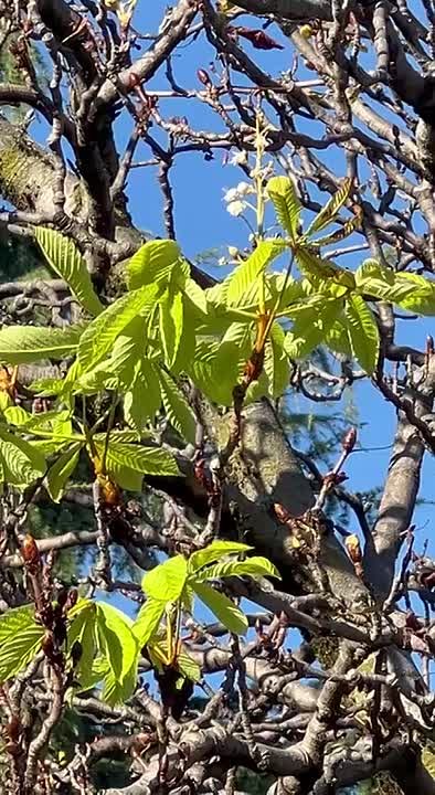 На некоторых деревьях, уже сбросивших листву, появились молодые побеги и соцветия, создавая контраст с оголенными ветвями.