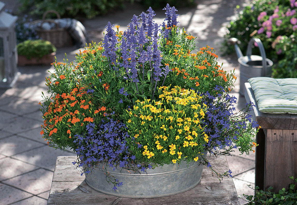 В качестве контейнера можно использовать оцинкованную бадью, которая станет отличной основой для яркой композиции. В ней будут гармонично смотреться мелкоцветные оранжевые и желтые бархатцы, цветущие до первых холодов. Эти растения славятся своим пряным ароматом и съедобными цветками, которые добавляют необычный вкус в салаты и десерты!
