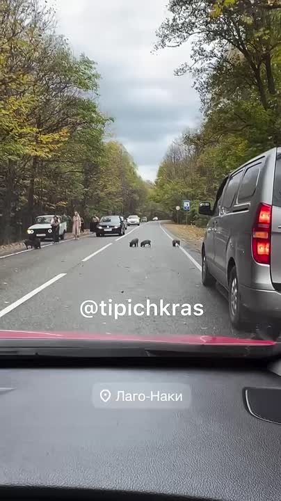 На этот раз по дороге в Лаго-Наки люди встретили милых кабанчиков. Как заведено, сразу достали телефоны и начали снимать живность. Главное тут, чтобы мамы и папы этих малышей рядом не оказалось. Нельзя терять бдительность.