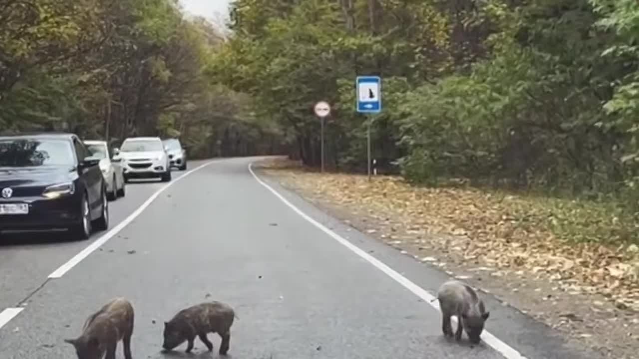 На трассе в районе Лаго-Наки движение замедлилось из-за семьи кабанов с детёнышами