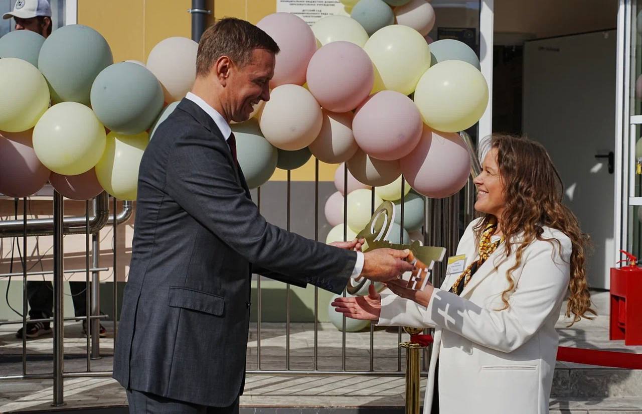 Андрей Кравченко, выступая с приветственной речью, поздравив воспитанников детского сада, их родителей и педагогов с новосельем, вручил символический ключ.