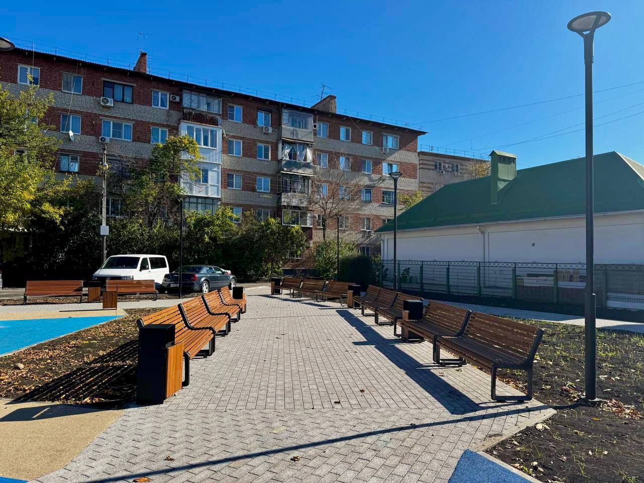 Для комфортного отдыха на свежем воздухе в сквере уложена новая тротуарная плитка, установлены удобные лавочки и стильные светильники для вечерних прогулок.