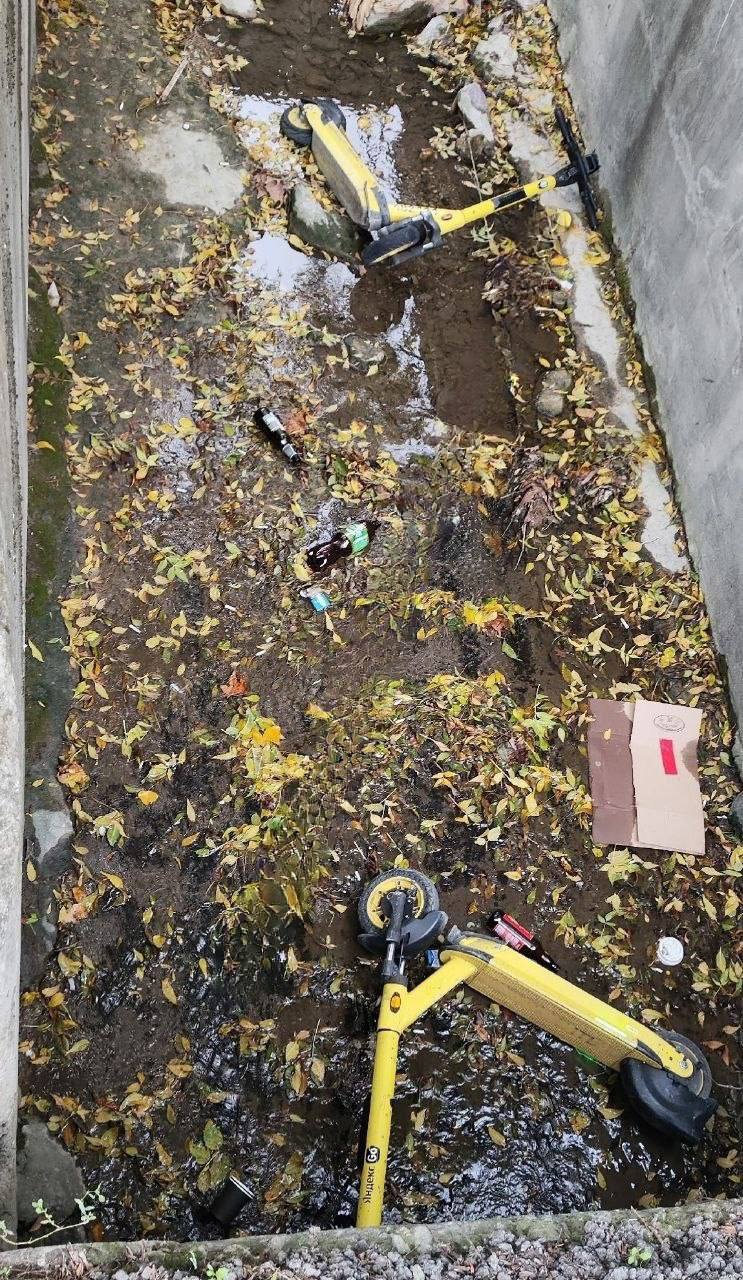 Кто-то топит их в канаве на Луначарского. Уничтожено уже шесть самокатов.