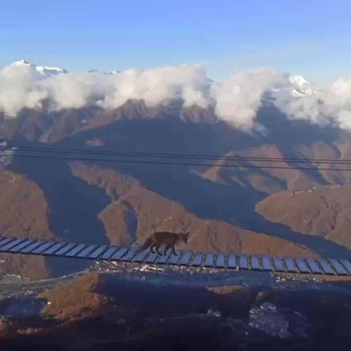 На подвесном мосту на высоте 2200 метров заметили лисицу. Она спокойно прогулялась по конструкции, будто каждый день так делает.