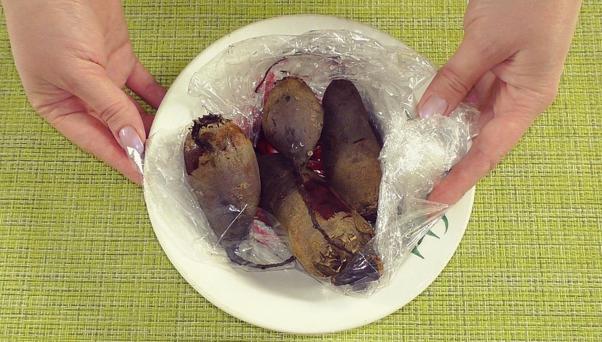 Для начала свеклу необходимо отварить заранее до мягкости. Если нет времени, её можно быстро приготовить в микроволновой печи, завернув в пакет для запекания. Просто сделайте в пакете несколько отверстий и готовьте на высокой мощности 8–10 минут.