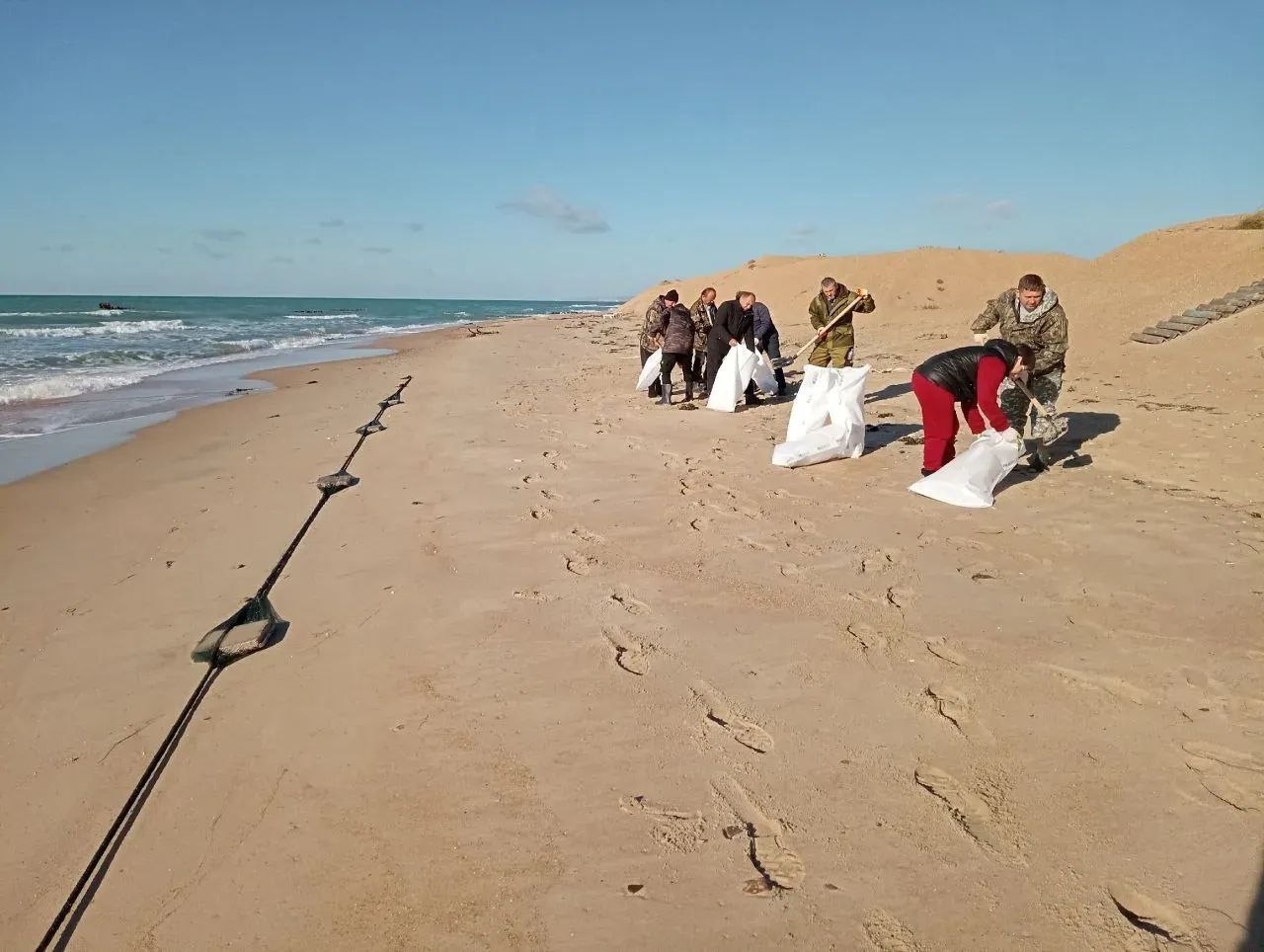 На Бугазской косе продолжают деликатную уборку ранее выброшенных частиц нефтепродуктов. Работы ведут представители муниципальных образований и сотрудники «Кубань-СПАС».