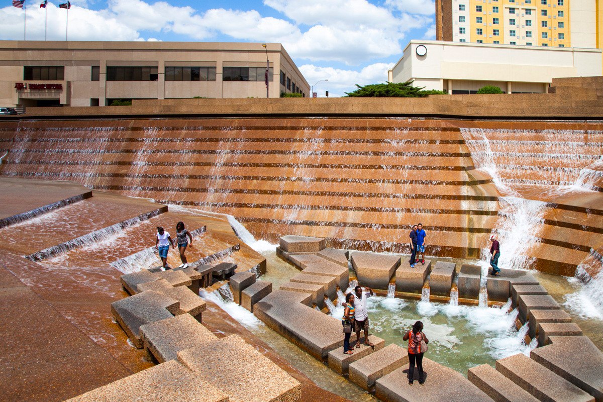 Американский парк Water Gardens был открыт в 1974 году и спроектирован архитекторами Филипом Джонсоном и Джоном Берджи. Его центральный элемент — «Активный бассейн» с падающей с высоты 11,5 метров водой — стал символом Форт-Уэрта. Там, как и в Краснодаре, архитекторы добились эффекта вовлечения зрителя: водопады можно наблюдать как сверху, так и проходя по узким ступенчатым дорожкам между потоками воды.
